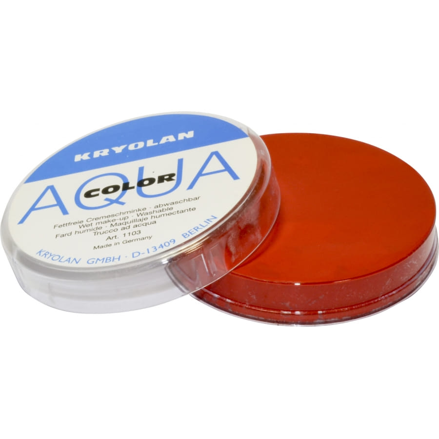 AquaColor de couleur rouge 079 de la marque professionnelle Kryolan. Ce pot contient 55 millilitres de maquillage à l'eau très facile à utiliser. En effet, il suffit d'un pinceau ou d'une éponge pour l'appliquer et un peu d'eau et de savon pour l'enlever. Fixez-le avec un peu de poudre sèche ou transparente.