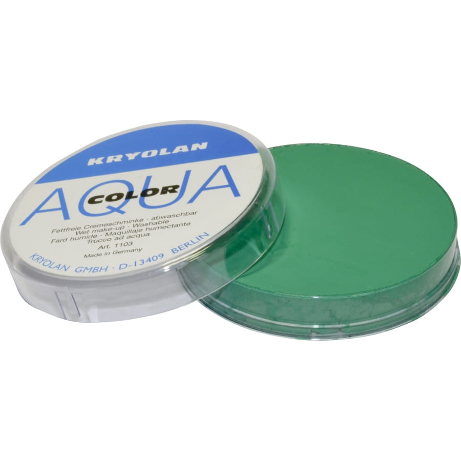 AquaColore de couleur verte, de la marque de qualité professionnelle Kryolan. Le pot contient 55 millilitres de maquillage pour environ 30 visages. Superposez les couleurs pour plus d'efficacité. Appliquez le maquillage à l'aide d'une éponge ou d'un pinceau et enlevez-le à l'eau et au savon. Vous pouvez utiliser une poudre transparente pour fixer votre maquillage.