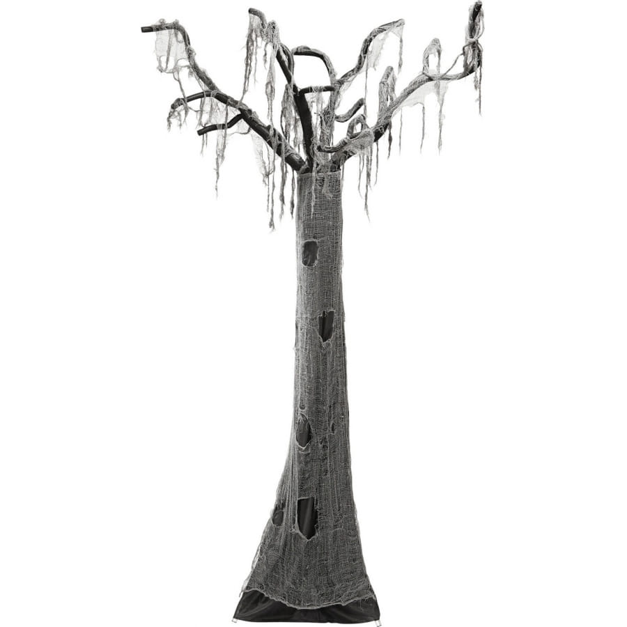 Cet arbre à l'aspect lugubre présente un tronc enveloppé d'un tissu noir et d'un filet gris qui réveillera vos peurs les plus enfouies.