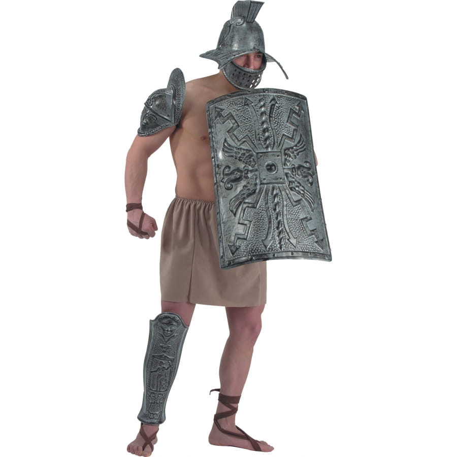 Idéale pour se déguiser en guerrier romain ou grec, cette armure de gladiateur de couleur argent est composé d'un casque, d'une épaule, d'une jambière et d'un bouclier de 65 cm par 45 cm avec des dessins sur le bouclier et aussi sur la jambière. Vous ne passerez pas inaperçu lors du carnaval dans ce déguisement.