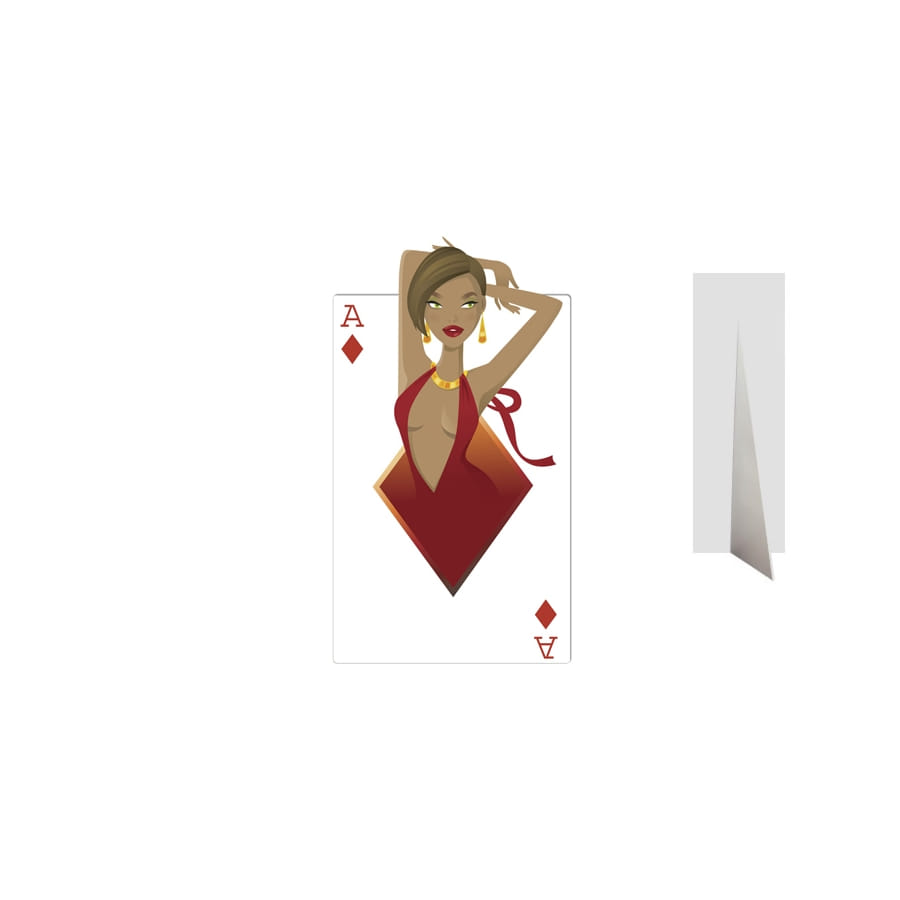 Vous qui êtes amateurs de jeux de cartes, avez-vous déjà pensé à utiliser les cartes comme décorations? Nous ne parlons pas des petites cartes mais de cet as de carreau géant sexy par exemple, qui a une hauteur de 160 cm. Elle pourra être posée n'importe où, de préférence dans votre salle de jeux. De plus, il y a une charmante femme avec une robe rouge décolletée sur la carte en carton, qui est elle aussi de couleur rouge et blanche.
