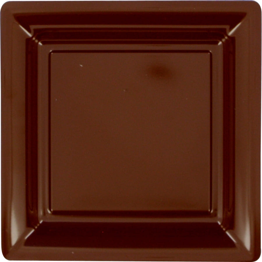 Assiettes en plastique carrées de couleur chocolat, vendues en lot de 12. Chacune des assiettes mesure 29 centimètres carrés. La couleur de ces assiettes-ci ira très bien à une décoration de Pâques ou de mariage.