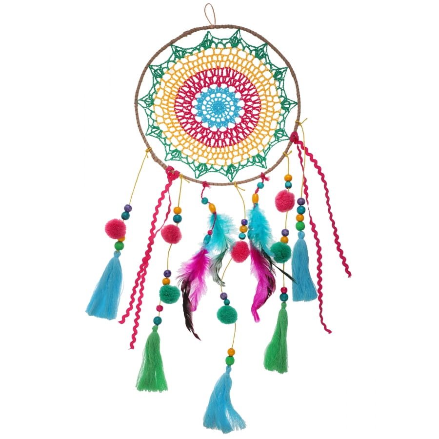 Cet instrument souvent utilisé à des fins surnaturelles, présente un tissage multicolore (vert, jaune, rose et bleu) en forme de toile d'araignée.