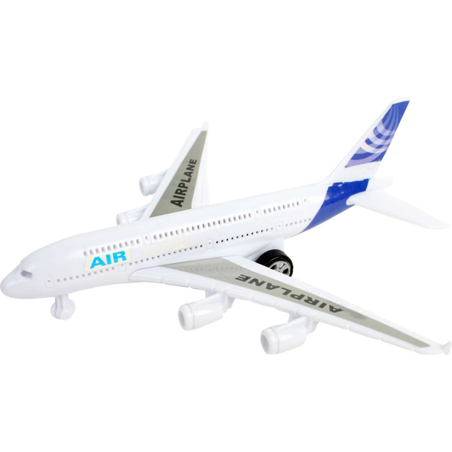 Avion de ligne blanc et bleu à rétrofriction. Ce jouet mesure entre 15 à 20 centimètres de longueur. Il vous sera impossible de choisir ni le modèle ni la couleur lors de la commande. Vous le recevrez comme présenté. Pour le faire avancer, il suffit de le reculer et de le relâcher.