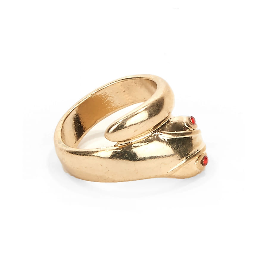 Bague dorée en forme de serpent avec deux fausses pierres rouges à la place des yeux. Cet accessoire est idéal pour compléter un déguisement de Cléopâtre ou de Néfertiti.