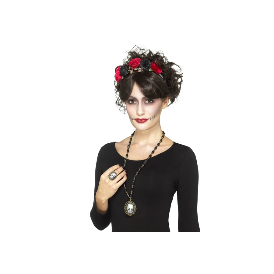 Les accessoires de costumes pour halloween bague et collier camée jour des morts rehausseront le côté sinistre de l'ensemble de votre tenue. Pour cet article vous aurez droit à un collier à fausses perles noires avec un pendentif rond. La bague porte également une version réduite du pendentif. Vous voilà parée de bijoux spécialement conçus pour la fête des morts !