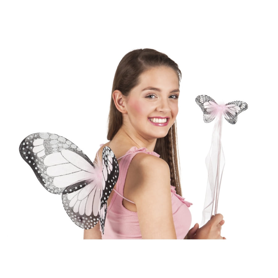 Pour un prochain carnaval ou une fête déguisée, vous pourrez facilement incarner une fée papillon avec ce kit baguette, ailes de papillon blanches noires et rose.