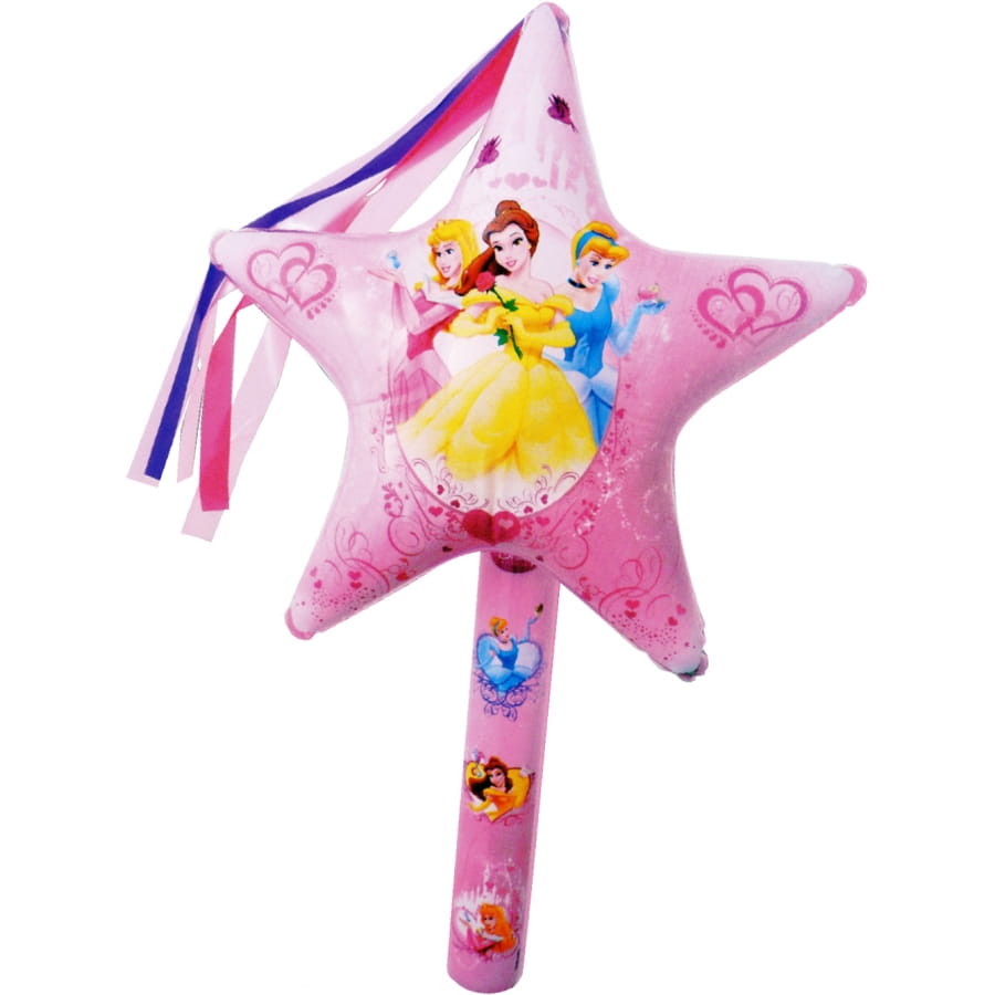 Baguette magique gonflable princesse Disney, de couleur rose, pour fille. La baguette est imprimée de plusieurs dessins représentant les princesse de Disney et de coeurs. Elle mesure 70 centimètres de long. Offrez-la à votre fille pour sa fête d'anniversaire.