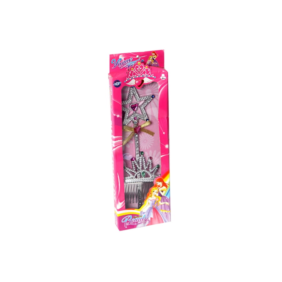 Boîte contenant une parure composé d'une baguette magique et d'un diadème. La baguette est en forme d'étoile emplie de strass argenté et de pierres roses et bleues. Le diadème est en forme de peigne à placer dans les cheveux, également composé de strass. La baguette mesure 28 centimètres de long et le diadème fait 10 centimètres de large.