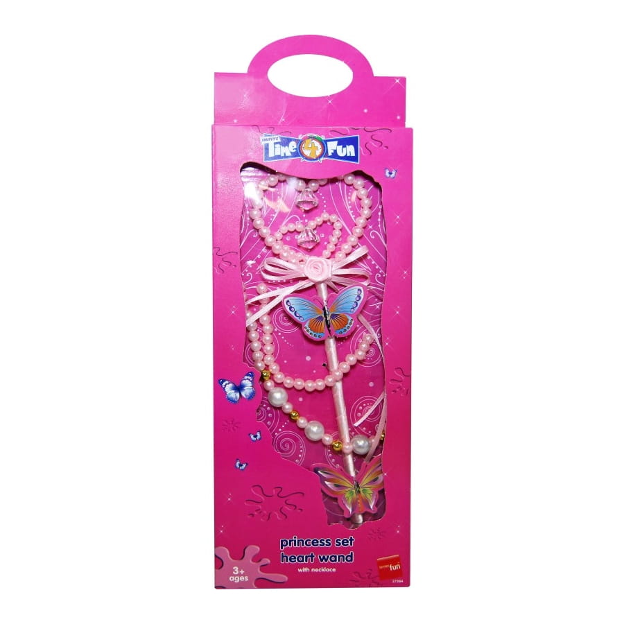 Offrez cette jolie baguette de princesse a votre fille si elle se déguise en princesse ou une fée. Ces accessoires compléteront son déguisement. Cette baguette de princesse est de couleur blanc avec deux papillons dessus ainsi qu'un cœur. Le collier est en fausses perles de couleur rose nacré.