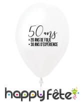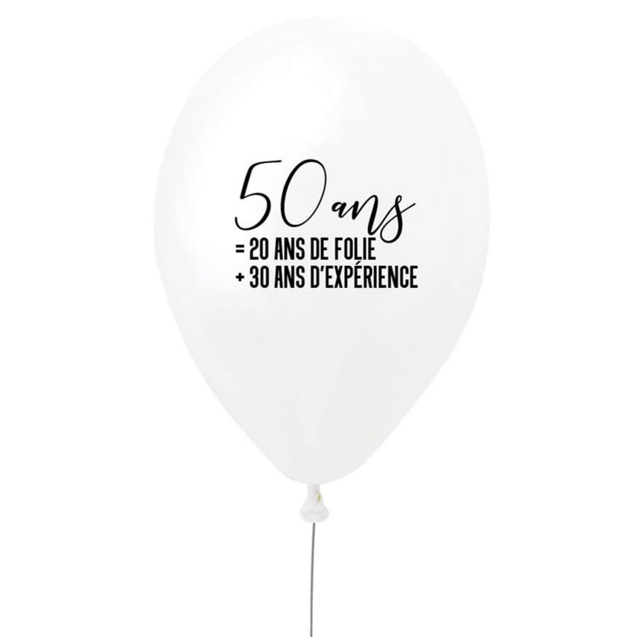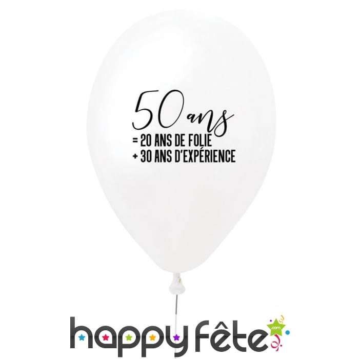 Ce ballon en latex de couleur blanche est imprimé de lettres noires formant une expression qui dit tout: "50 ans =20 ans de folie + 30 ans d'expérience".