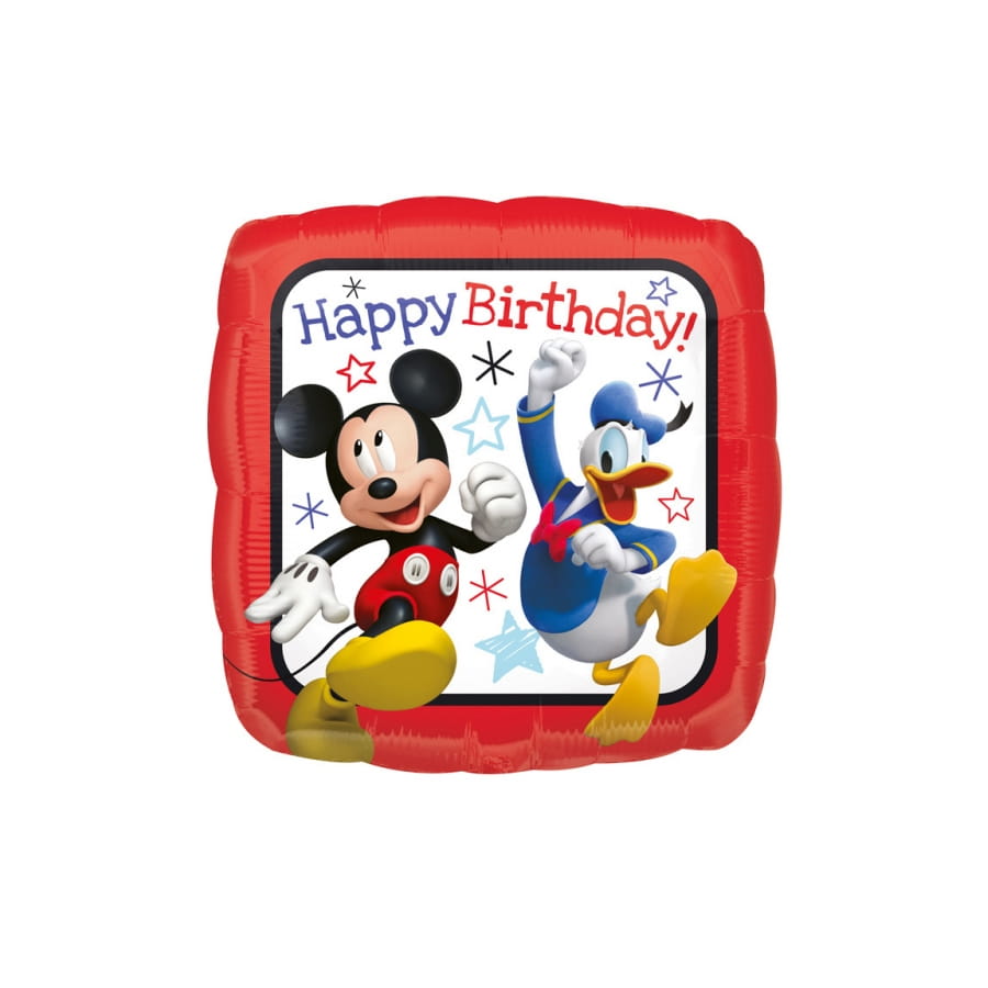 Le ballon carré Mickey mousse Happy Birthday 40 cm est en aluminium.