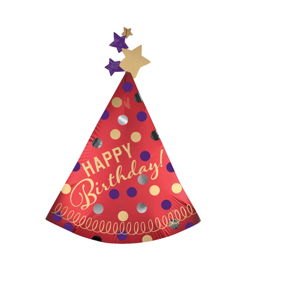 Le ballon chapeau pointu rouge Happy Birthday de 68 x 91 cm est en aluminium.