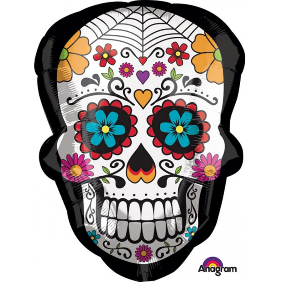 Ce ballon en aluminium représente un crâne Dia de los muertos d'environ 45 x 60 cm.