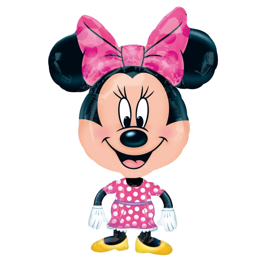 Ce ballon est aux traits de Minnie, dans son accoutrement hautement reconnaissable (robe rose avec des points circulaires blancs, chaussures jaunes, gants blancs et noeud papillon sur la tête).