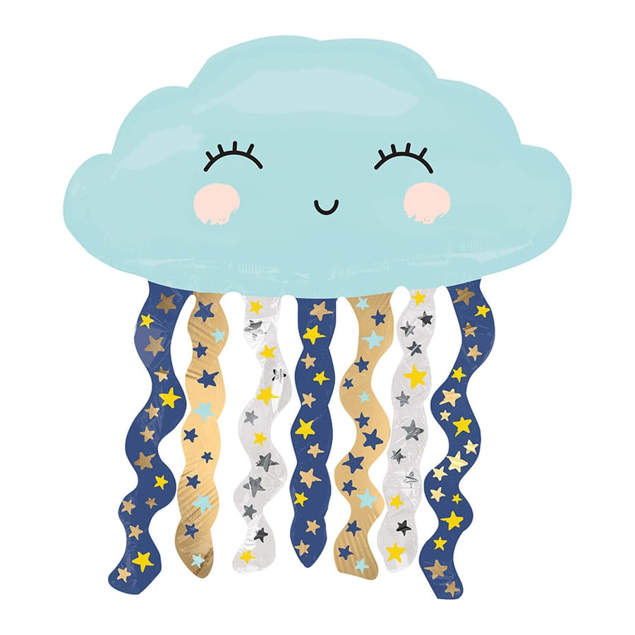 La ballon présente un nuage bleu aux joues rose pâle avec des imprimés d'yeux et d'une bouche souriante.