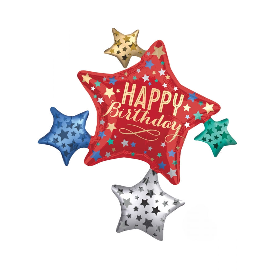 Le ballon étoiles happy birthday coloré de 81 x 88 cm est en aluminium.