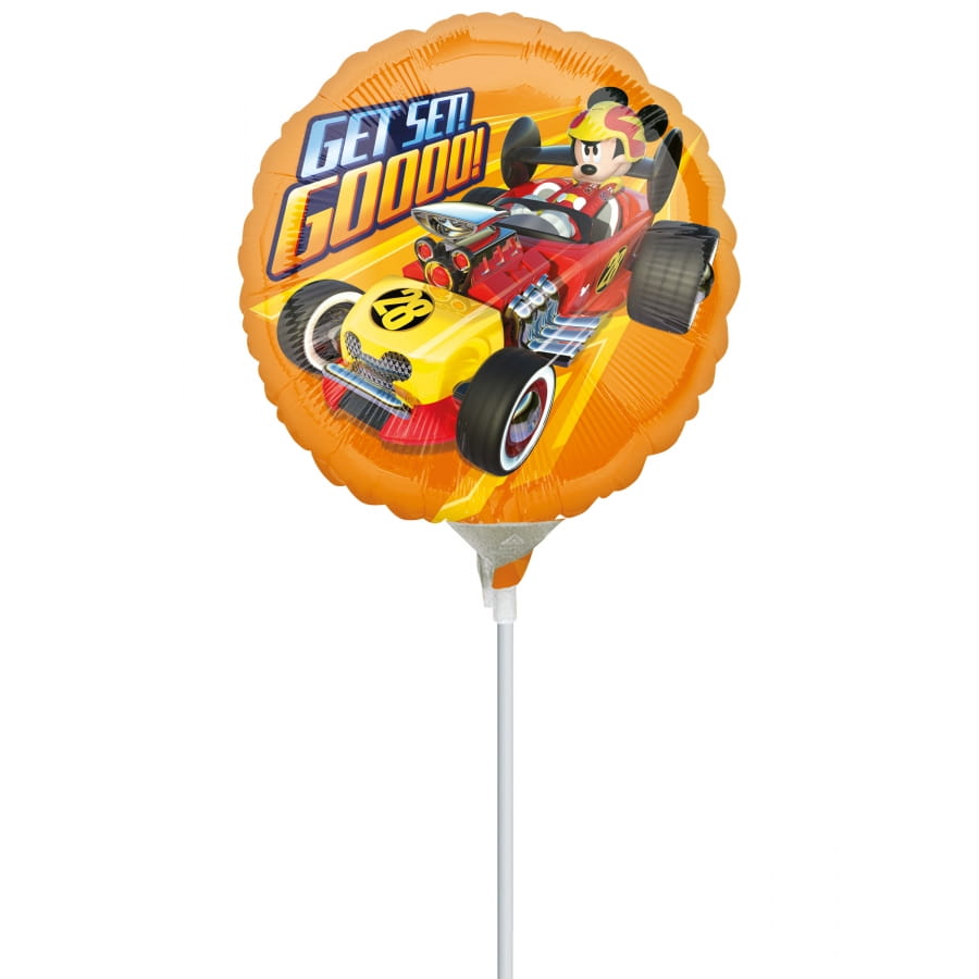 Il s'agit d'un ballon en aluminium qui présente Mickey dans son bolide, sur fond orange avec l'inscription "Get set! Goooo!".