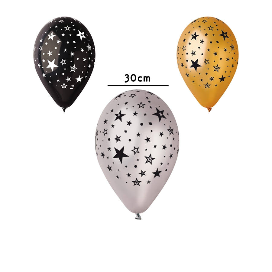 Des milliers d'étoiles qui font rêvasser ont été intégrés à ces ballons décoratifs. Penchez pour l'article ballon motifs étoiles à l'occasion du Nouvel An ou pour un événement spécial. Le modèle fait 30 cm de diamètre. Il est proposé dans les couleurs argent, noir et or et bronze. L'article existe en sachet de 10 et en sachet de 50 pour chaque couleur.