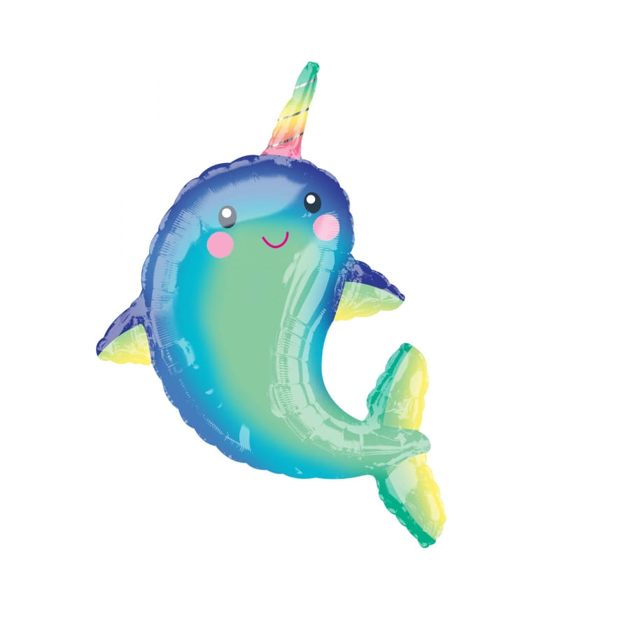 Le ballon narval multicolore de 73 x 99 cm est en aluminium.