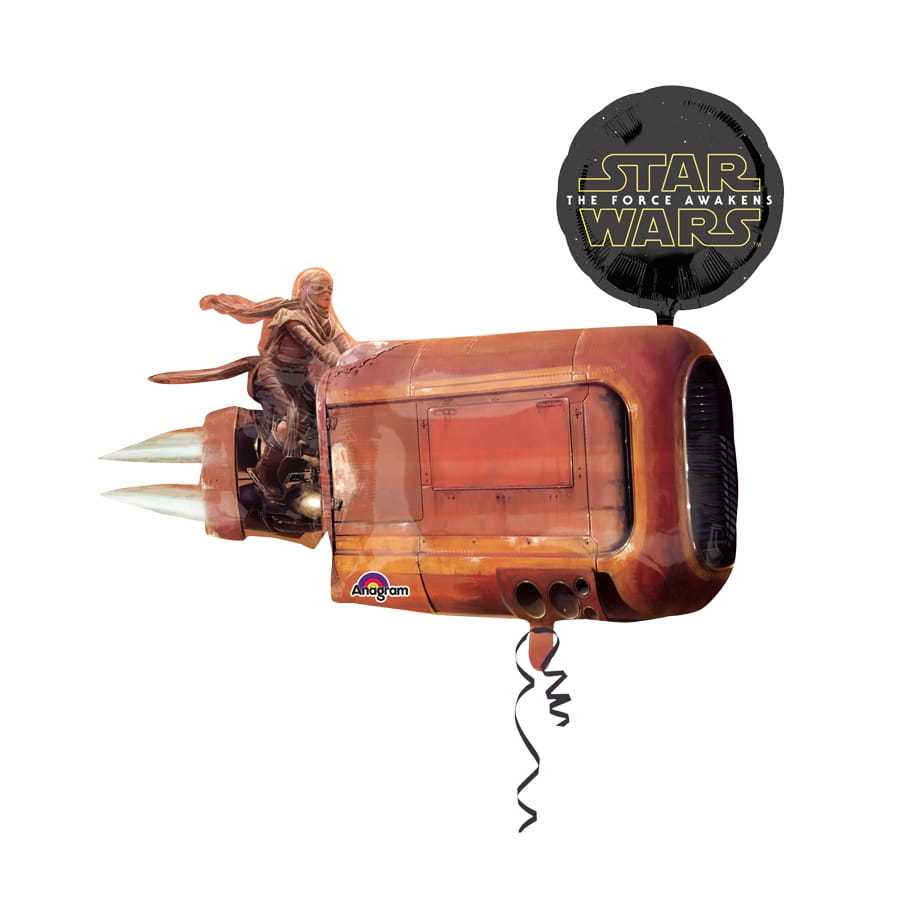 Poursuivez votre quête de produits Star Wars avec ce ballon Rey sur son vaisseau des sables. L'article est sous licence Star Wars, de couleur marron, et mesure 83cm x 73cm. Il représente le personnage vedette de l'épisode VII Le Réveil de la Force. Le ballon gonflable est à l'effigie de Rey accompagnée d'un char des sables.