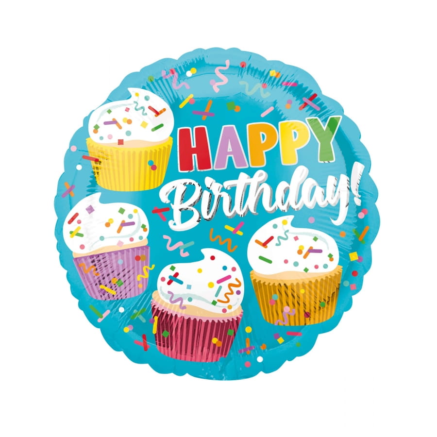 Le ballon rond cupcakes Happy Birthday de 43 cm est en aluminium.