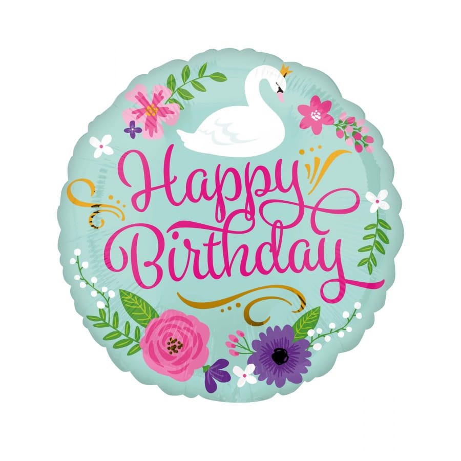 Le ballon rond happy birthday cygne fleuri de 43cm est en aluminium.
