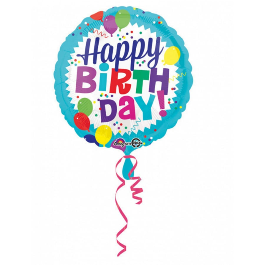 Le ballon rond Happy Birthday fond bleu de 43 cm est en aluminium.