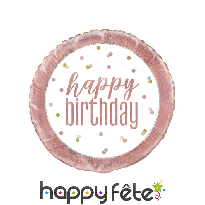 Il est question ici d'un ballon brillant de forme circulaire. Il fait 45 cm de diamètre. Il est principalement blanc et rose. On peut lire clairement au centre de cette décoration l'expression "happy birthday" en lettres roses. Celles-ci sont entourées de pois multicolores, le tout sur fond blanc lui-même entouré d'une bordure rose.
