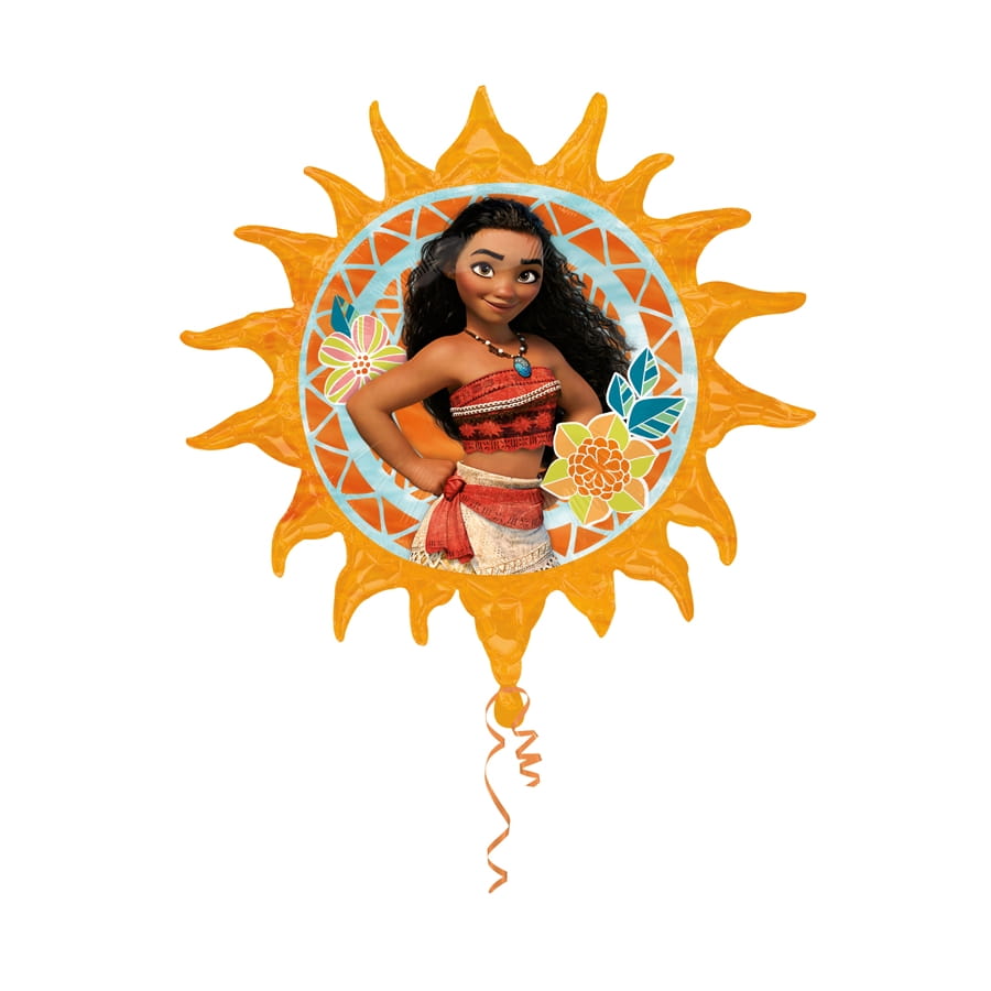 Vaiana est bien sûr mise en relief au milieu de ce ballon de 71 x 73 cm, toute de rouge vêtue, entourée d'un magnifique soleil orangé.