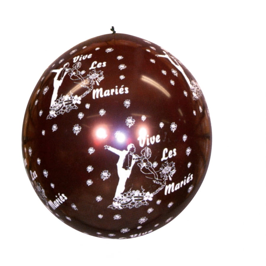 Ballon couleur chocolat imprimé de motifs et de "Vive les mariés" en blanc. Ce ballon est fabriqué en latex naturel et biodégradable. Il peut être gonflé à l'air ou à l'hélium. Il mesure 85 centimètres. Accessoire parfait pour un mariage.