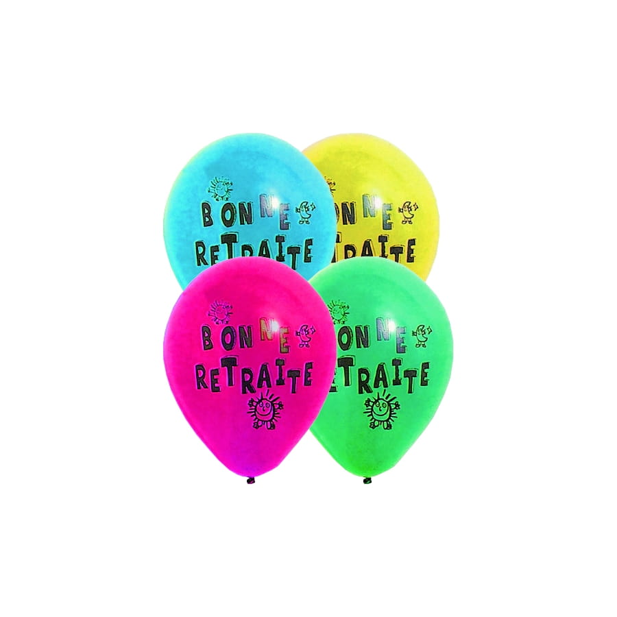 Un lot de 10 ballons de bonne retraite. Vous pourrez les utiliser pour célébrer la retraite d'un de vos collègues ou un de vos proches. Ce lot de 10 ballons de couleur assortis fait 30 centimètres de diamètre pour une circonférence de 105 centimètres avec écrit dessus bonne retraite en noir avec quelques dessins.