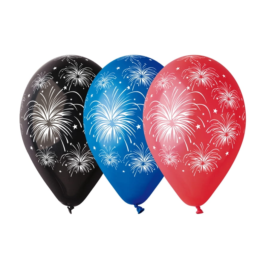 Parfaits pour les fêtes ces 100 ballons multicolores imprimés de motifs de feux d'artifice. Ces ballons biodégradables et gonflables à l'air ou à l'hélium mesurent 30 centimètres de diamètre et 105 centimètres de circonférence. Ils sont idéaux pour la Noël ou pour le Nouvel An.