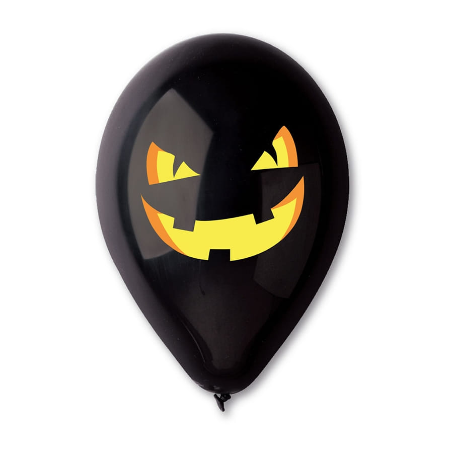 Les ballons sont fabriqués à base de latex naturel et présentent des motifs sur fond noir, rappelant des yeux et une bouche édentée de citrouille.