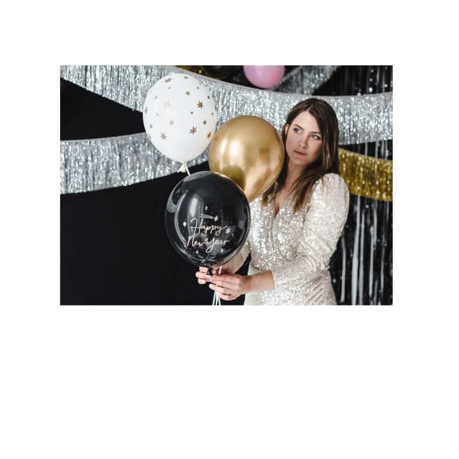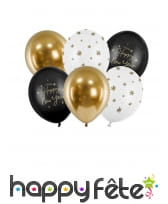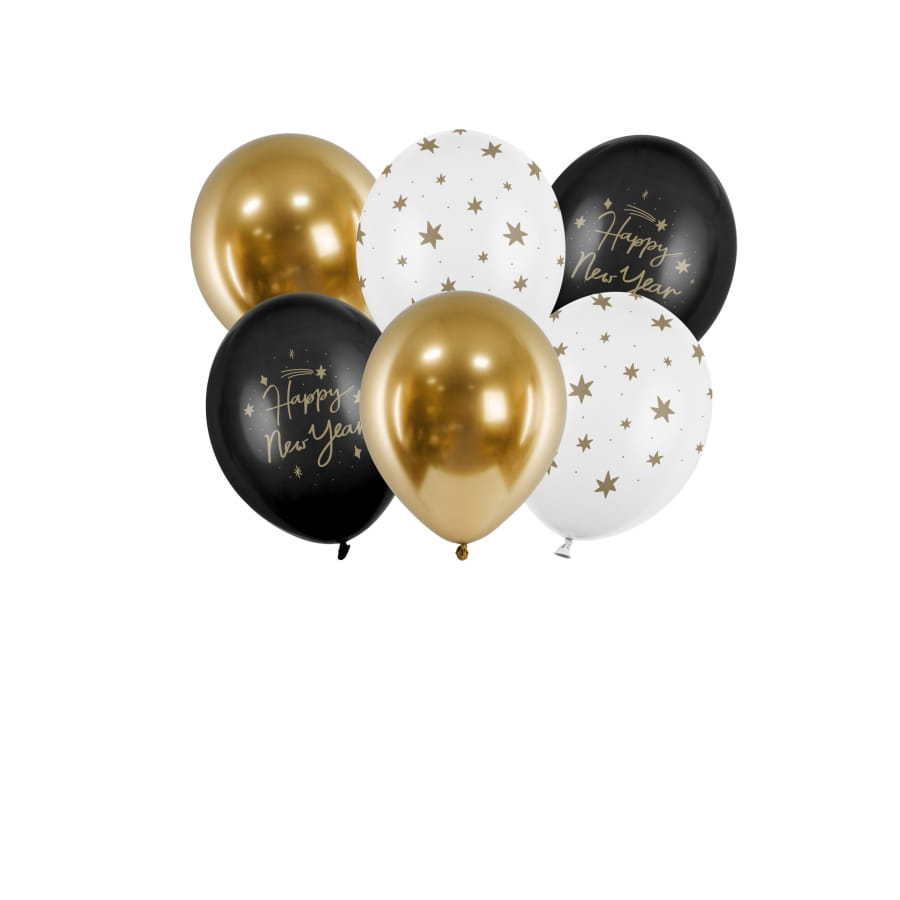 Le lot de ballons comprend un ballon noir et doré avec l'inscription Happy New Year dorée entourée d'étoiles dorées, deux ballons dorés unis, deux ballons noirs décorés de l'inscription Happy New Year dorée avec quelques étoiles dorées et deux ballons blancs décorés d'étoiles dorées de différentes tailles.