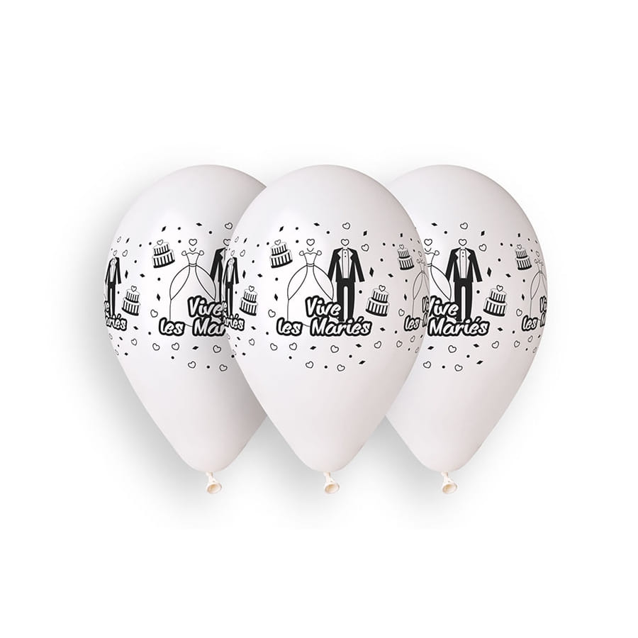 Les ballons sont de couleur blanche, avec l'expression " Vive les mariés" imprimée en noir.