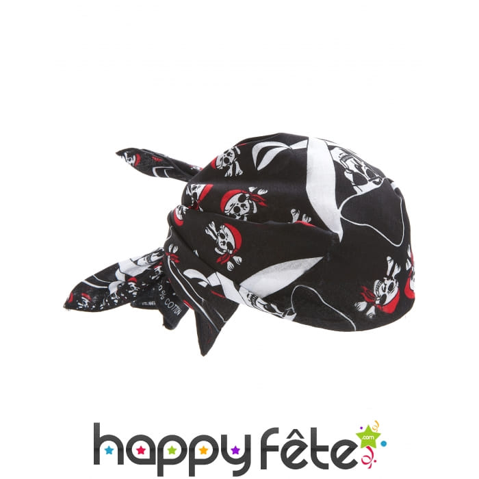 Des motifs têtes de mort pirate revêtant un bandeau rouge et des sabres blancs agrémentent toute la largeur de ce foulard.