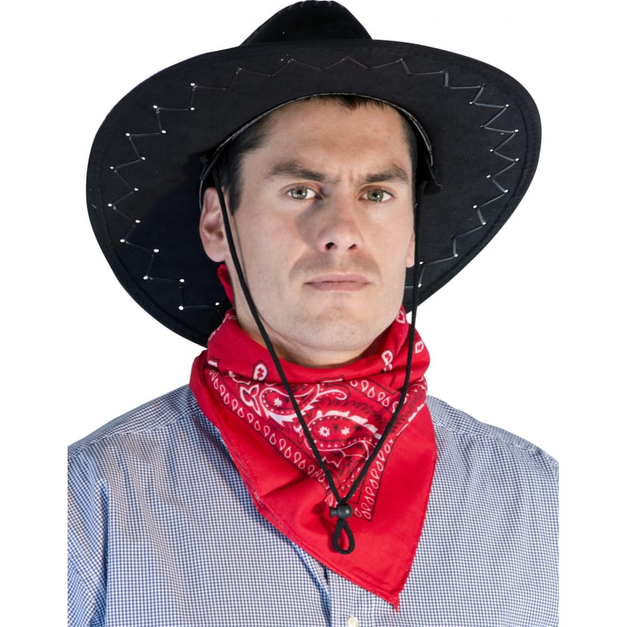 Bandana rouge et blanc. Les dimensions de cet accessoire sont de 55 centimètres sur 55 centimètres. Il est idéal pour compléter avec succès un déguisement de cowboy.