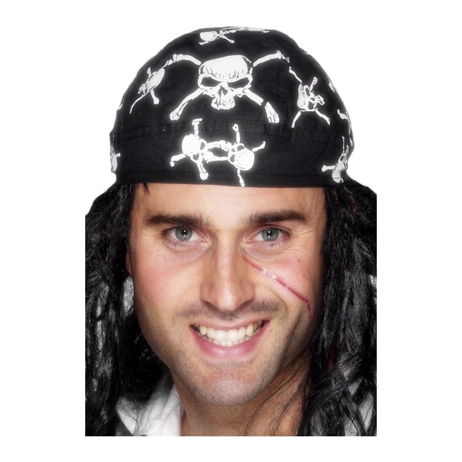 Bandana de couleur noire, pour homme, avec une multitude de têtes de mort de couleur blanche imprimées dessus. Cet accessoire est très utile pour compléter un déguisement de pirate ou de biker.