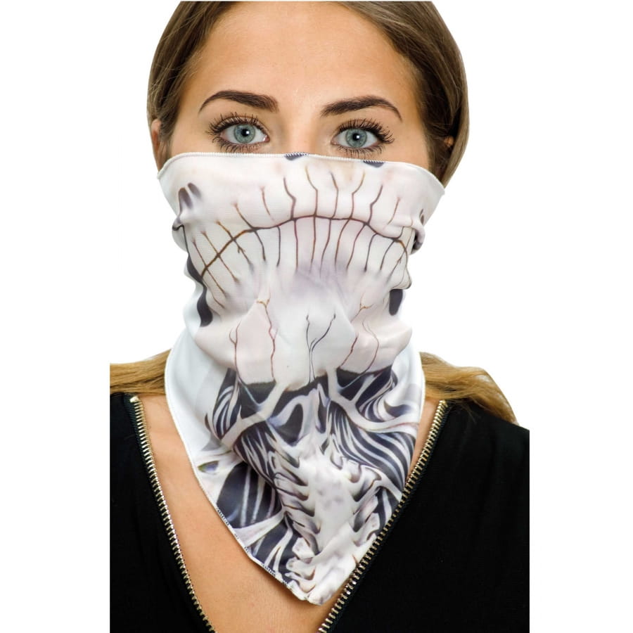 Ce bandana tour de cou bouche squelette fait approximativement 30,5 x 22,5 cm et a été réalisé de façon à s'enfiler facilement par la tête.