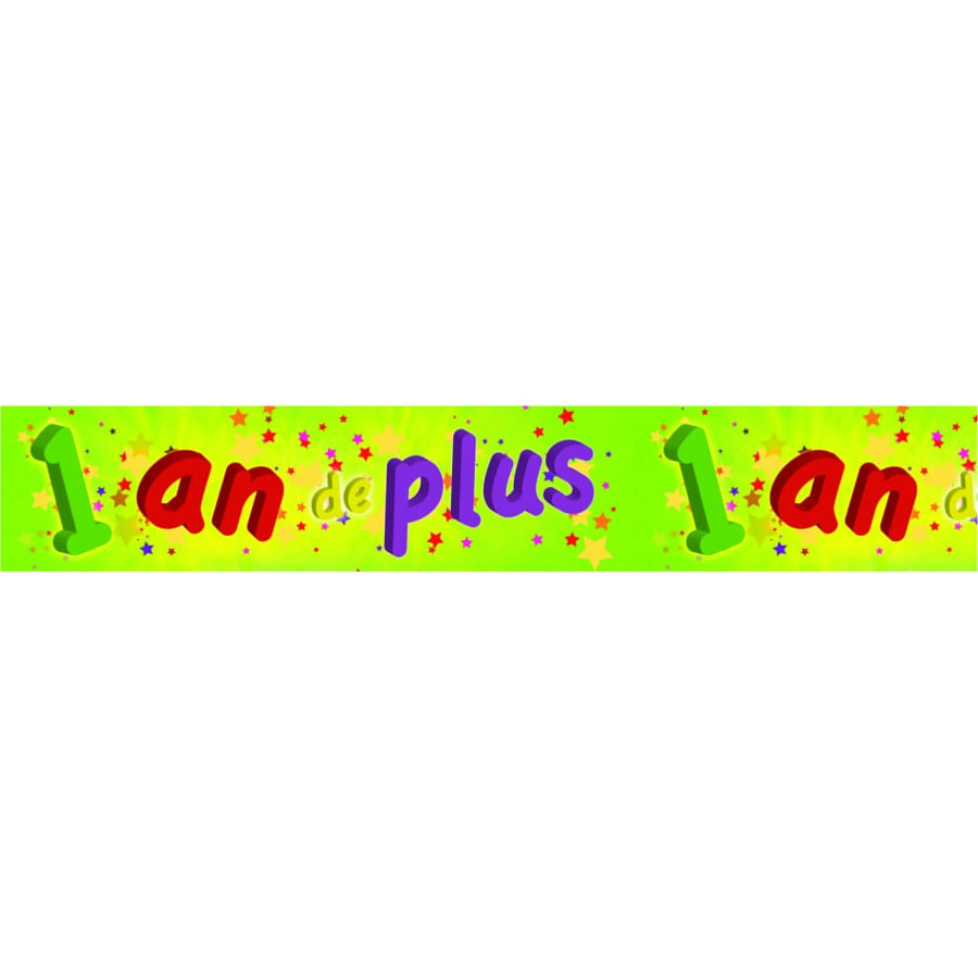 Banderole en papier de couleur rouge, verte et violette avec "1 an de plus" imprimé tout le long. Cet accessoire mesure 0.16 centimètres de large sur une longueur de 2 mètres 44. Elle sera idéale pour un anniversaire ou autre évènement.