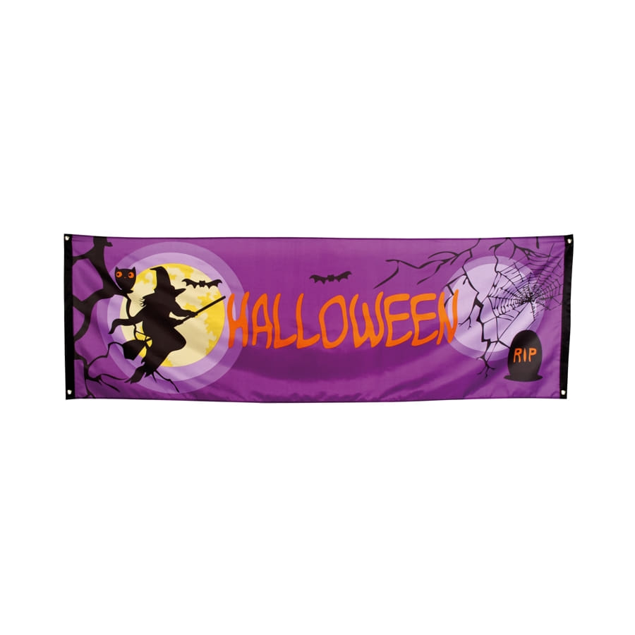 Il s'agit d'une large banderole en polyester. Cet accessoire est proposé sur Happyfête.com aux dimensions de 74x220cm. Il lui faut ainsi assez d'espace pour l'installer. Histoire de planter le décor et de donner la frousse à toute la famille avec le thème de la sorcière qui vole sur son balai parmi les chauves-souris. Idéale pour la décoration de salle pour votre soirée d'Halloween.