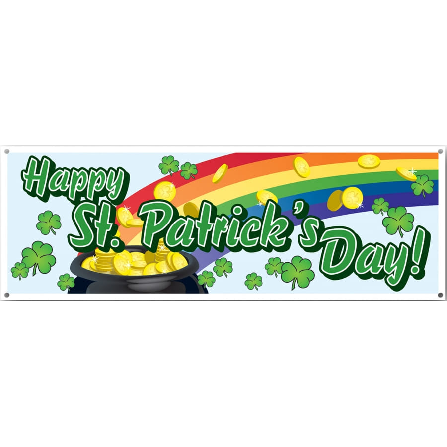 D'une dimension de 1,5 m x 53,3 cm, cette bannière de couleur blanche affiche l'inscription "Happy St-Patrick's Day" en vert.
