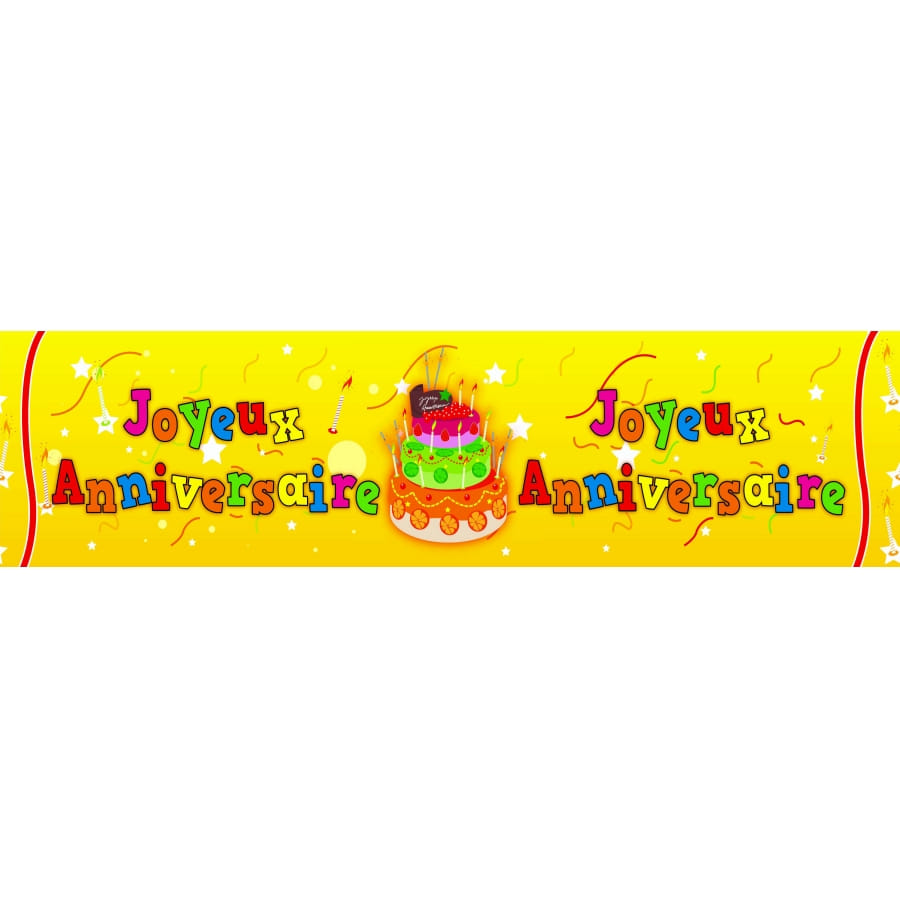 Pour la décoration d'un anniversaire pourquoi ne pas vous en servir de cette magnifique banderole en papier. Cette banderole 'joyeux anniversaire' de couleur jaune avec écrit dessus joyeux anniversaire et il y a aussi un gâteau multicolore sur la banderole. Elle fait0.16* 2.44 m.