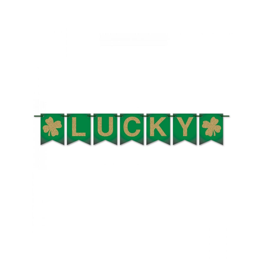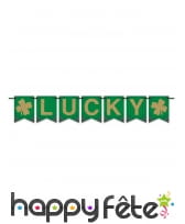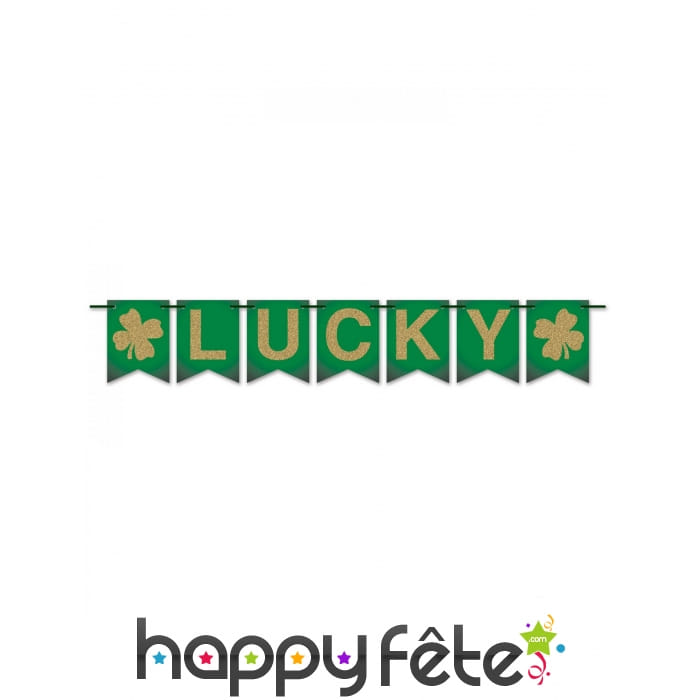 Les lettres forment le mot "LUCKY" et sont encadrées de 2 fanions imprimés d'un trèfle doré.