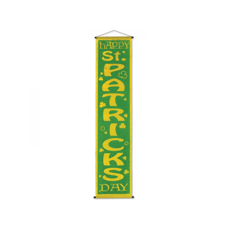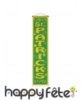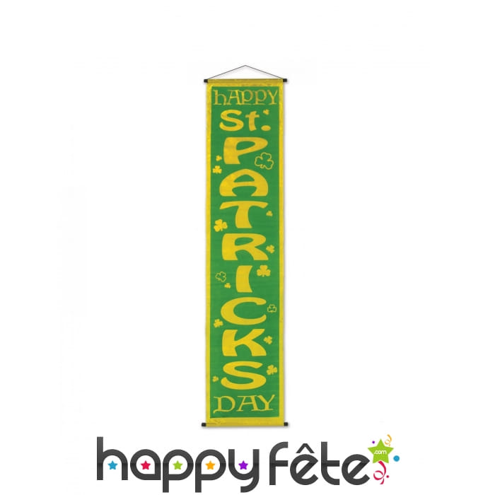 Cette bannière est verte avec une bordure jaune et des lettres dorées formant verticalement l'expression "hAPPY ST. PATRICK'S DAY".