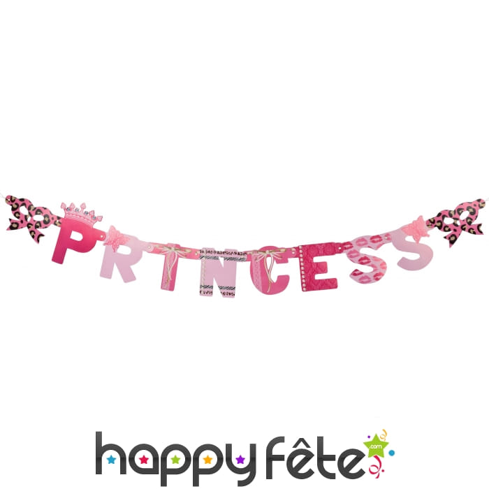Avec le mot "princess" écrit en grandes lettres à l'entrée de la salle, la fête s'annonce être sous le signe d'un conte de fée ! Cette bannière de lettres princess, 1,65 m de long va faire beaucoup d'effet ! Il s'agit d'une guirlande en carton avec des lettres imprimées en rose et un noeud sur chaque extrémité.