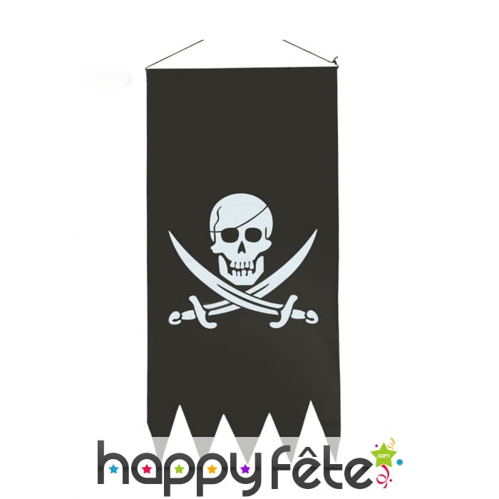 Fait de tissu fin noir, légèrement brillant, ce drapeau, signé Oriflamme, évoque le mystère des sept mers. Le symbole de pirate floqué en blanc au centre est ce qui donne vraiment le ton. Rien de mieux pour donner à votre lieu de fête une atmosphère de 'île au trésor'.