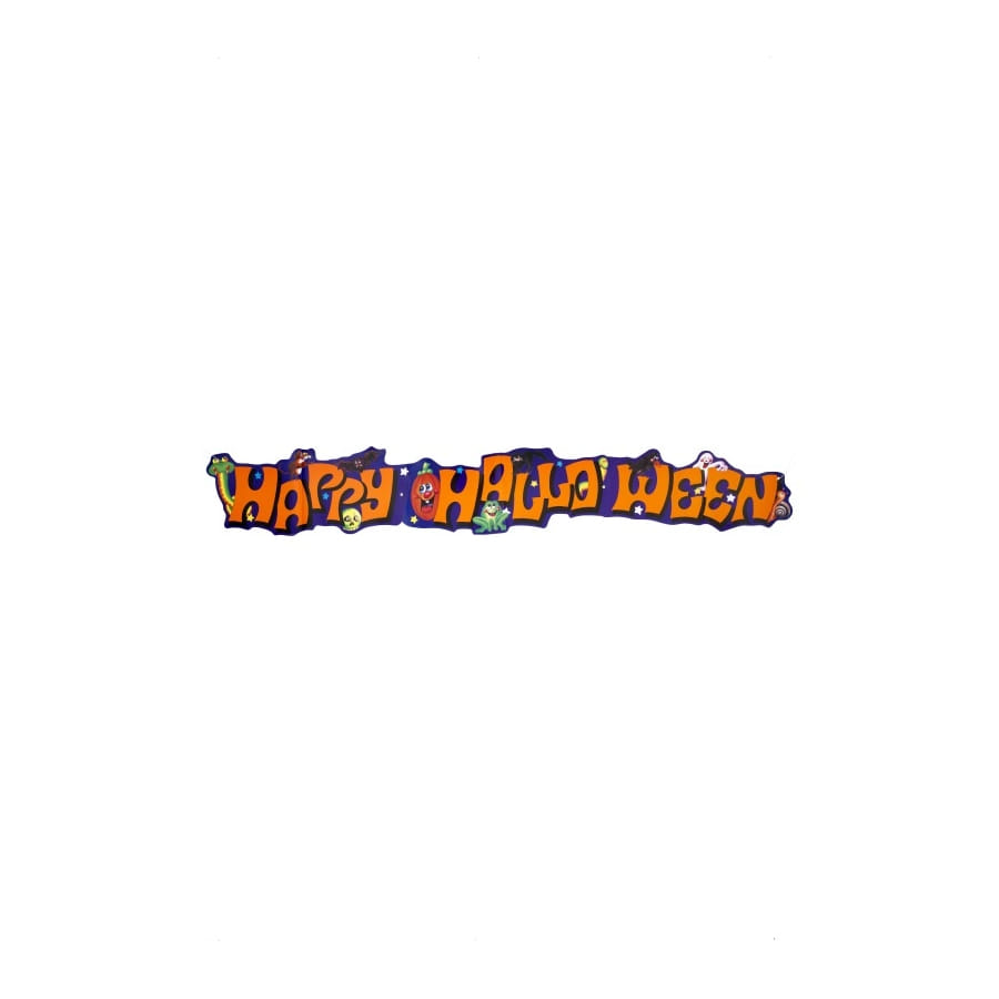 Bannière de couleur orange "Happy Halloween", avec petits animaux, citrouilles et fantômes pour la décorer. En accrochant cette bannière chez vous, vous ajouterez un peu de gaieté à l'ambiance d'Halloween.