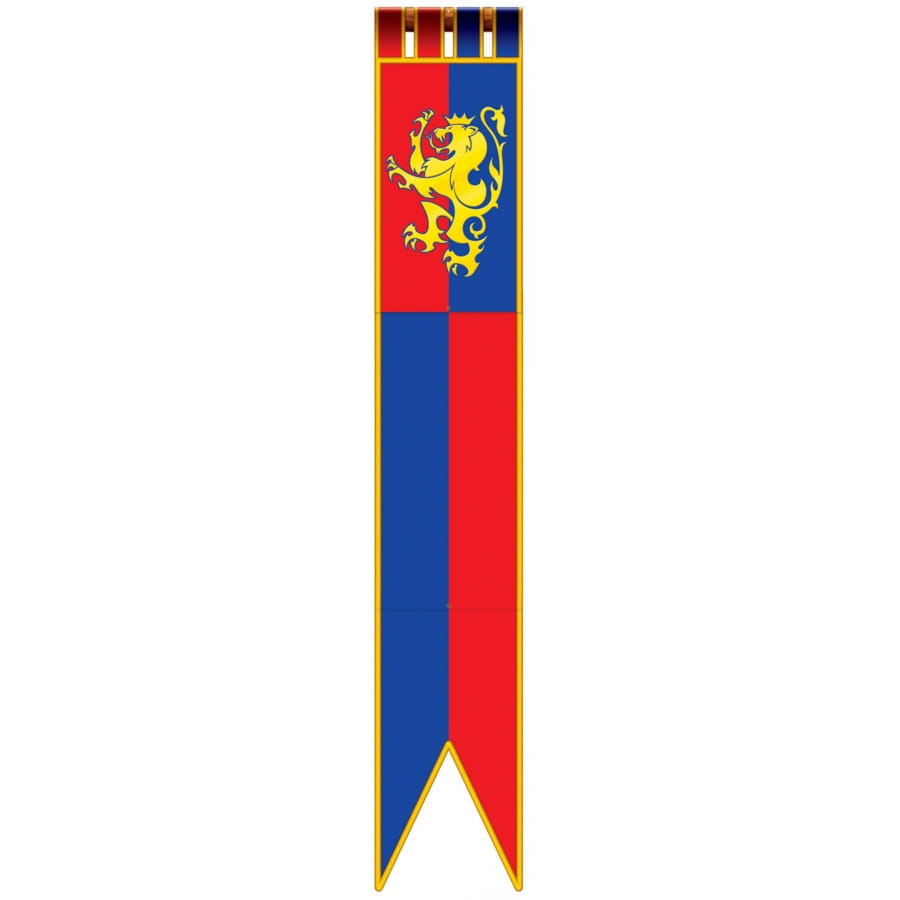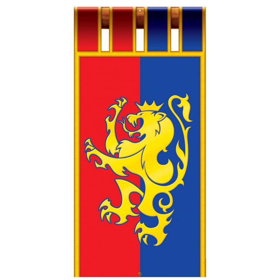 Cette bannière médiévale à suspendre reprend les couleurs d'un drapeau médiéval avec des bandes rouges et bleues, accompagnées d'un imprimé en forme de lion doré.